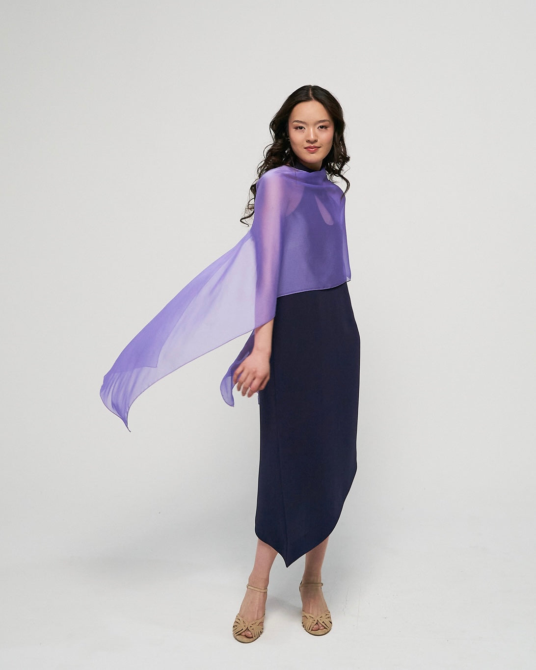 La tela es una gasa de doble hilo, catiónica, con muchísimo movimiento, en color lavanda, color lila, súper elegante.