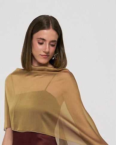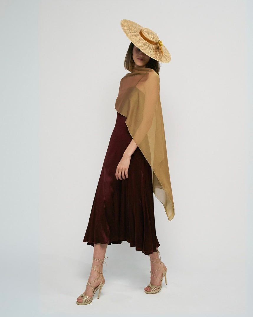 La tela es una gasa de doble hilo, catiónica, con muchísimo movimiento, en color dorado, aceite con reflejos terracota y mostaza, es ideal!