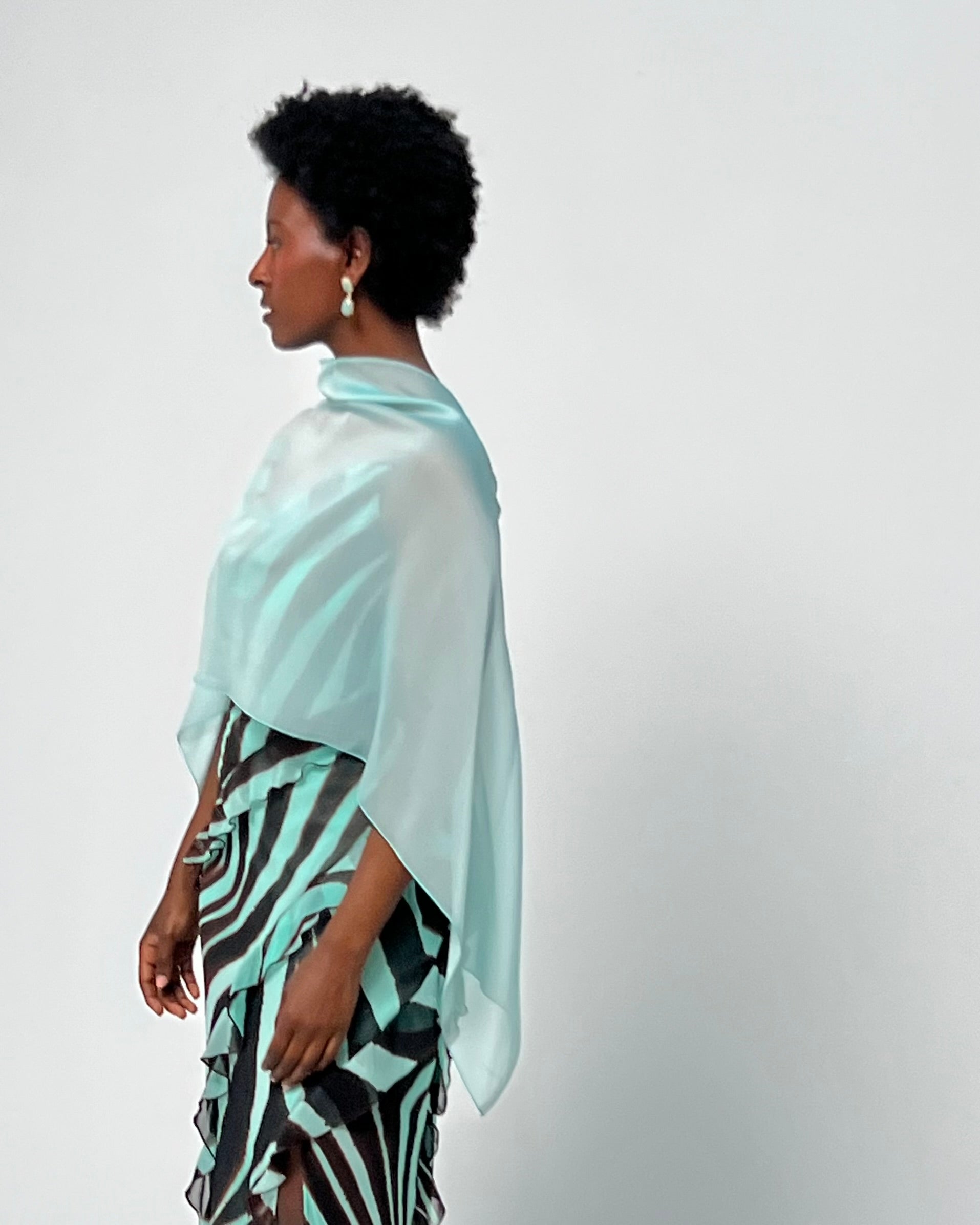 Capa gasa catiónica color azul aguamarina para invitadas.