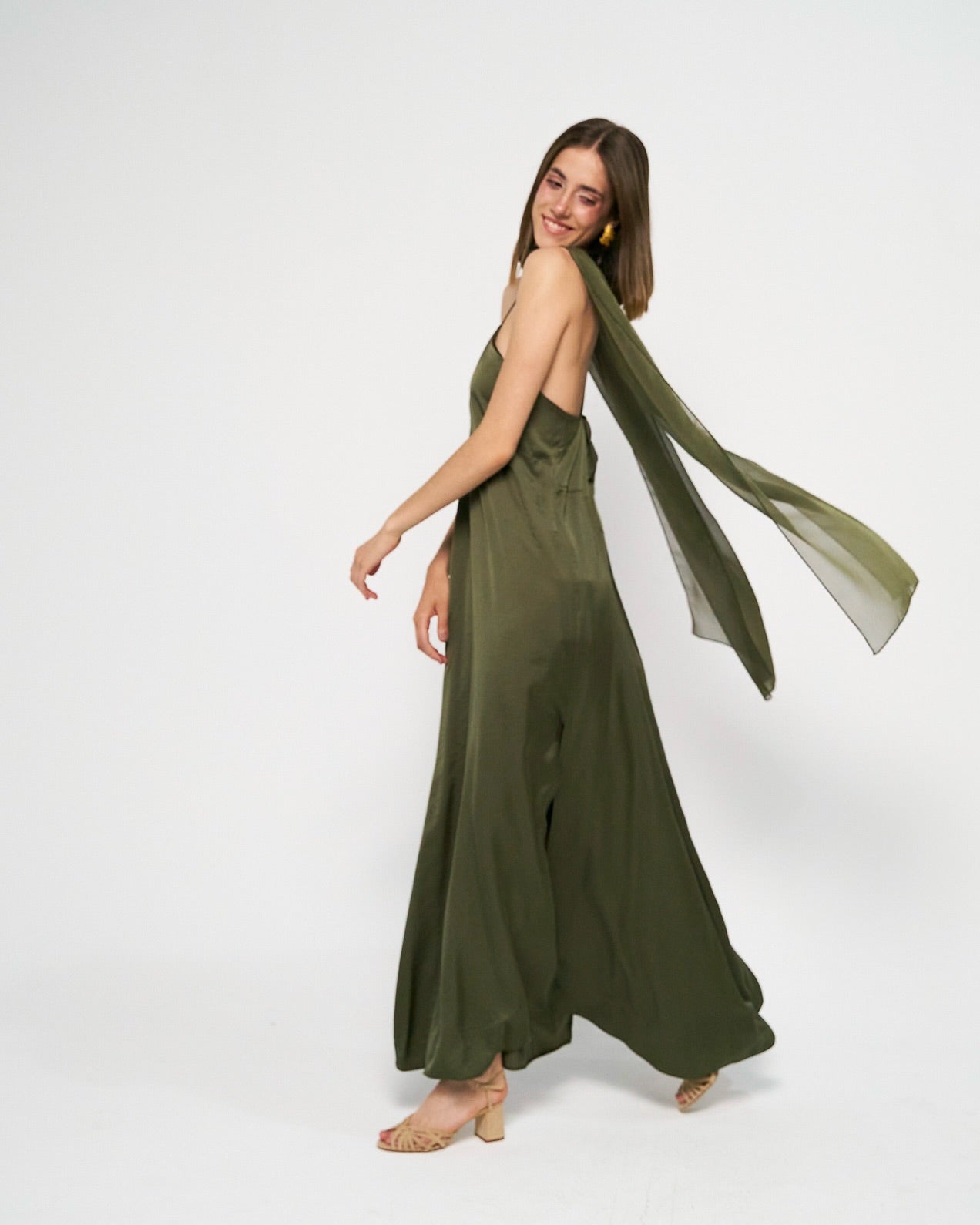 La tela es una gasa de doble hilo, catiónica, con muchísimo movimiento, en color verde caza.
