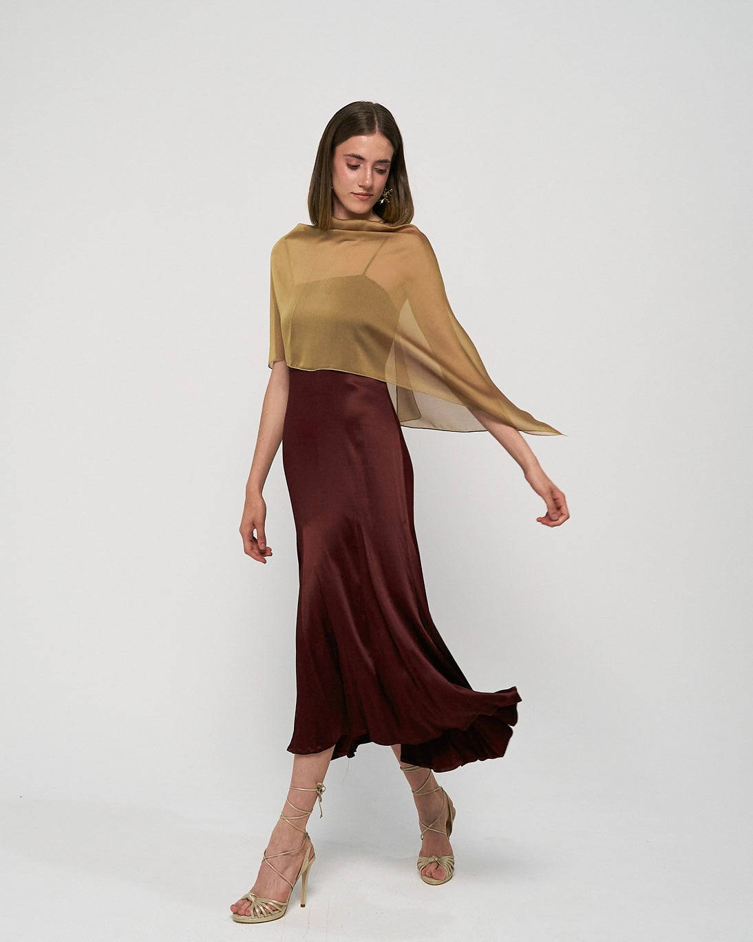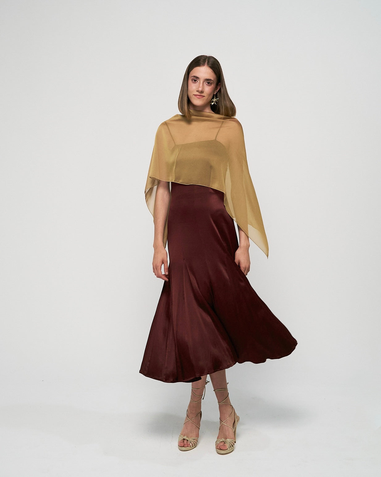 La tela es una gasa de doble hilo, catiónica, con muchísimo movimiento, en color dorado, aceite con reflejos terracota y mostaza, es ideal!