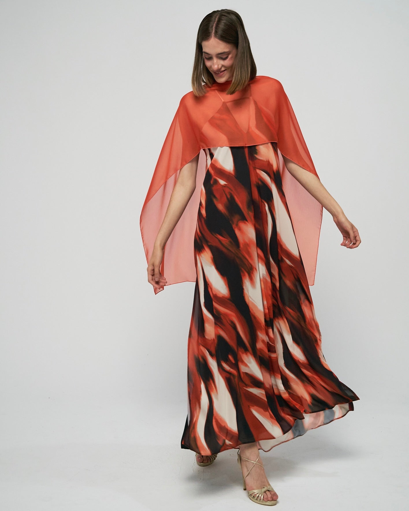La tela es una gasa de doble hilo, catiónica, con muchísimo movimiento, en color naranja.