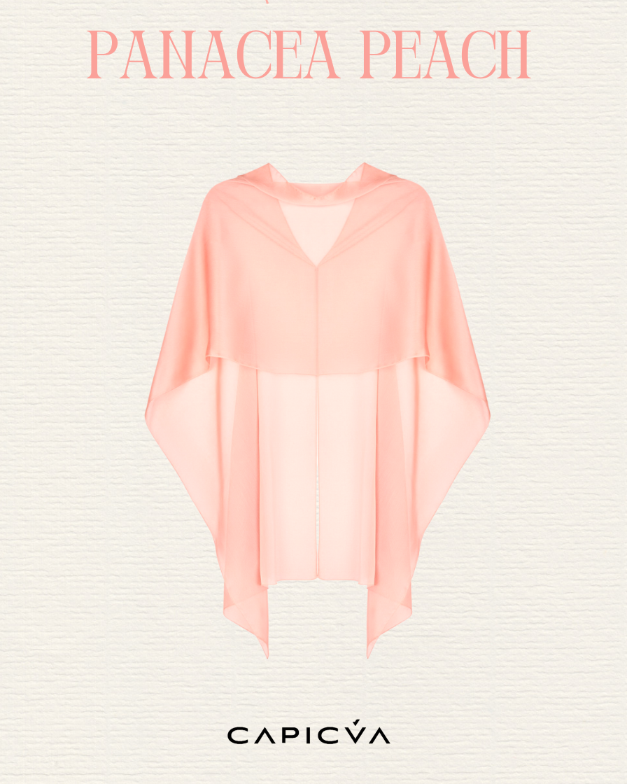 La tela es una gasa de doble hilo, catiónica, con muchísimo movimiento, en color peach (mezcla rosa claro y naranja claro). La gasa catiónica es una tela con mucha caída y un tacto muy suave, textura fina y agradable al tacto. La gasa catiónica está caracterizada por que se según el reflejo de la luz en el tejido, éste cambia de tonalidad momentáneamente.