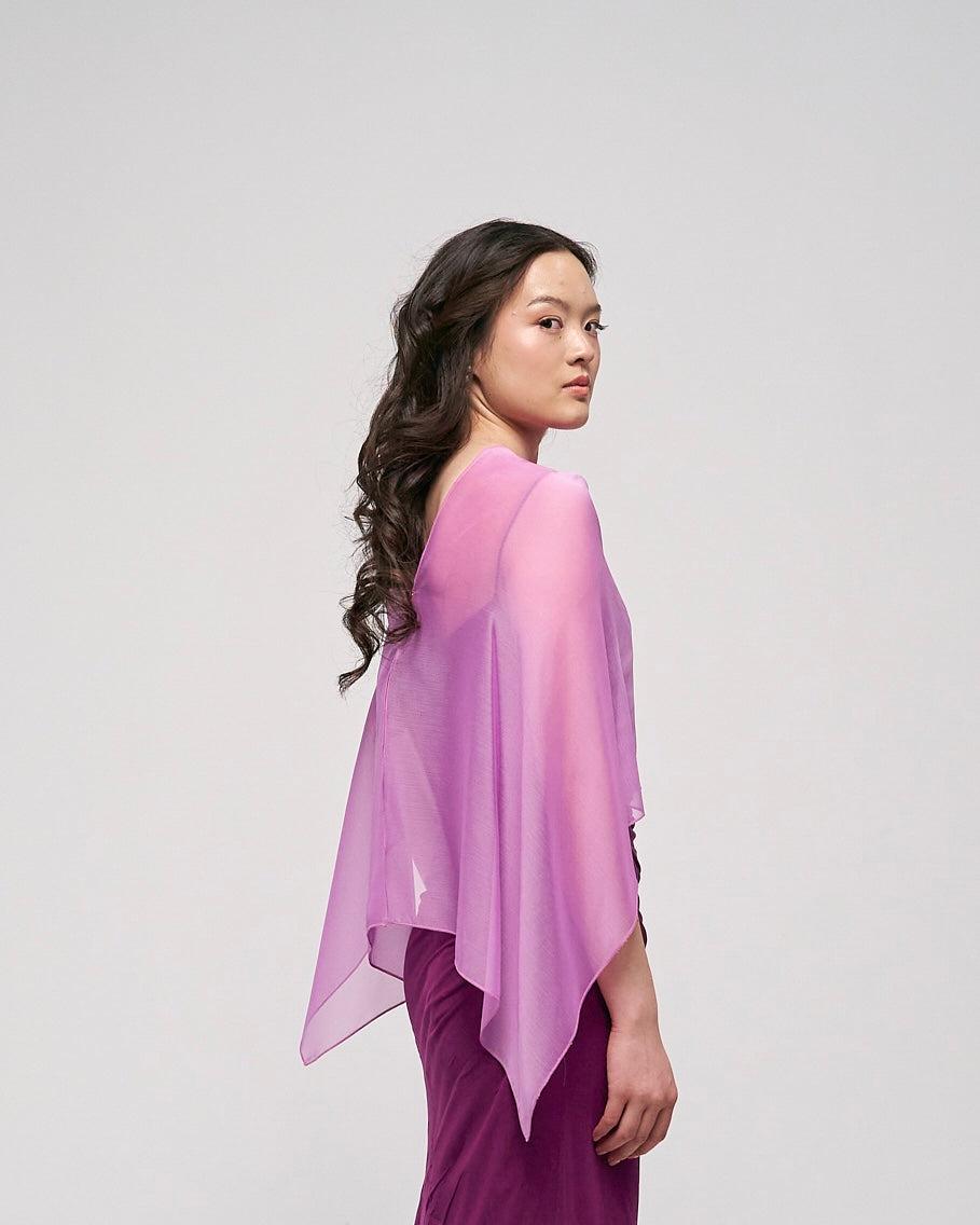 La tela es una gasa de doble hilo, catiónica, con muchísimo movimiento, en color rosa y malva y con reflejos claritos y oscuros
